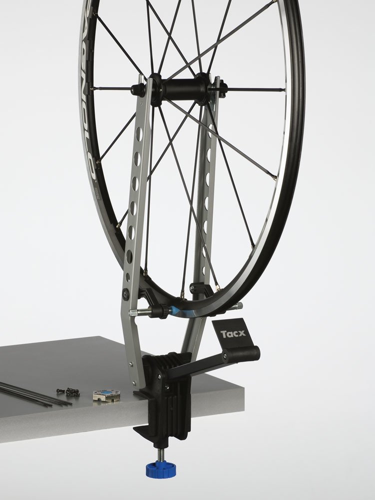 Centrownica TACX. Przystosowana do mocowania do blatu stolu warsztatowego o grubosci od 2 do 5cm. Przeznaczona do centrowania kól o rozmiarach od 16 do 28″.