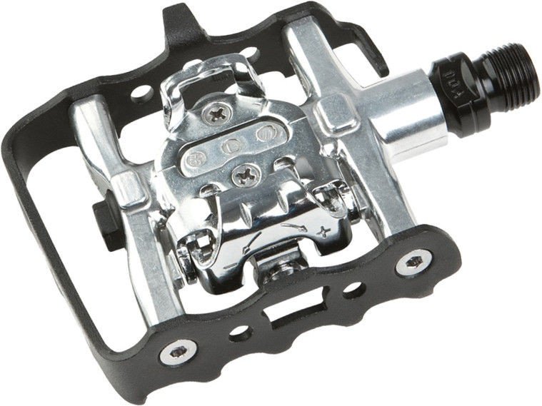Jednostronne pedaly zatrzaskowe. Korpus i oslona korpusu aluminiowe. Os wykonana ze stali Cr-Mo. Wysokiej klasy lozyska maszynowe zapewniajace duza plynnosc obrotów. Regulacja napiecia zatrzasku. W komplecie progi SPD.